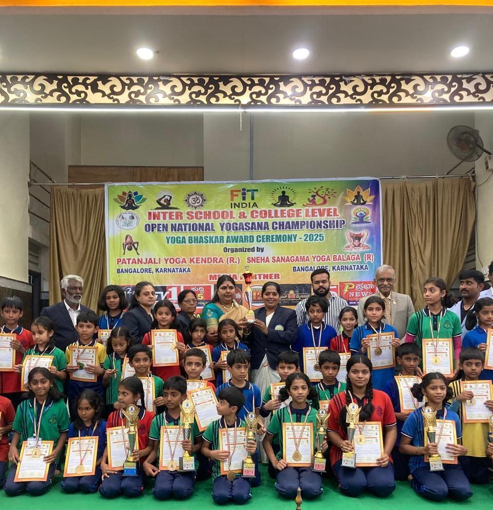 The Inter-school & college level open national yogasana championship 2025 was organised by Patanjali Yoga Kendra and Sneha Sangama Yoga Balaga, held at Basaveshwara Bhavana, Laggere. From our school, 37 children had participated. In those students below the 12-year age group:-